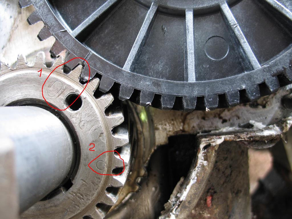 Заменил шестерню р/вала. Не могу завести мотор. Схватывает, но не заводится. Подскажите пожалуйста, какой вариант правильный 1 или 2? Какая метка "0" на шестерне к/вала нужная? Говорят ещё можно по количеству зубов посчитать... ?