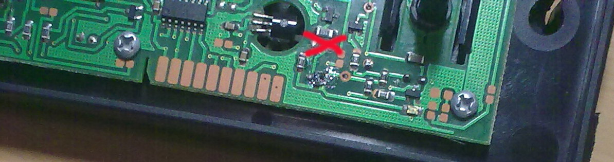 Доброго времени суток. Такая проблемка - поломалась плата управления климатом на ГАЗ-31105 (поморгала светоиндикация и далее никаких признаков жизни, кондиционера на авто нет) При подаче питания на двигатель с плассмасовой крыльчаткой на этой плате - (от источника на прямую) двигатель секунду крутит, меняю клемы - крутит секуну в другую сторону и снова тишина - вопрос такой - этот движечеч должен постоянно крутиться при подаче питания или нет - не могу понять как он должен правильно работать - или он живой или ему приходит конец. Еще нашел что (видимо резистор) напополам поломан (возможно отгорел так). Кто может подскажет что на нем написано (циферки должны стоять на нем), я туда впаял резистор 10ком - никаких изминений. На картинке плата немного не такая - рерюк стоит на моей плате на месте крестика, а выше - пустые контакты. Новая запчастина 7500р стоит - дороговато - а тут зима на носу...